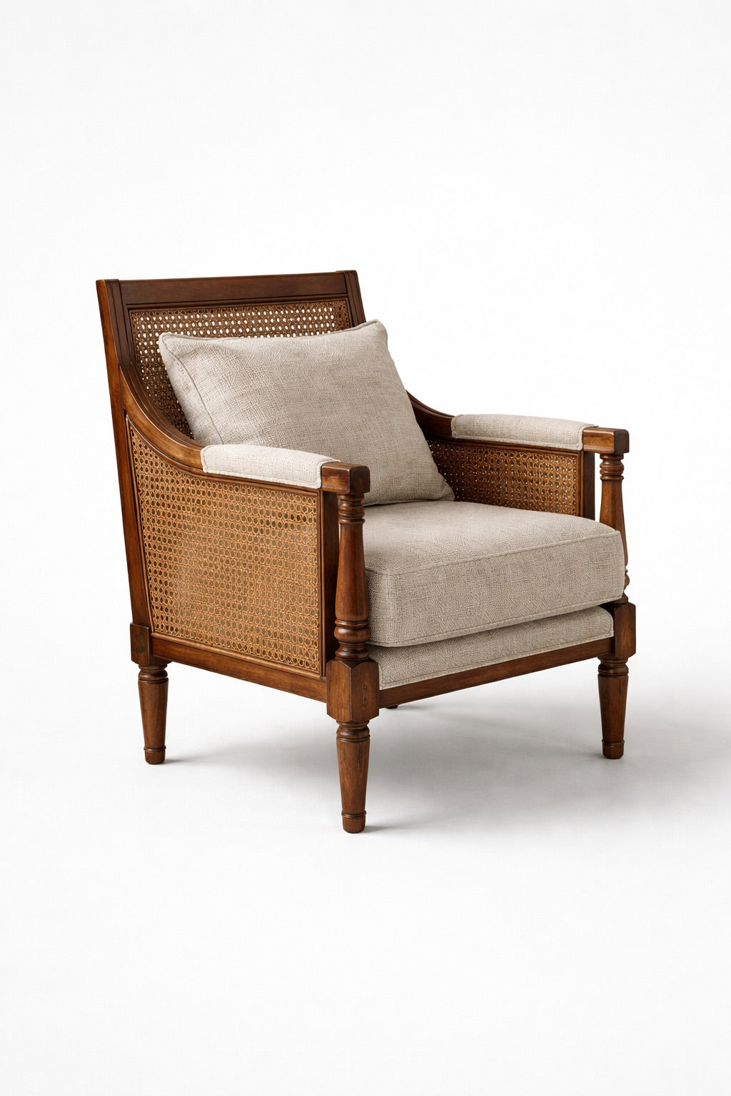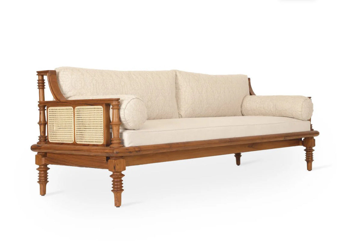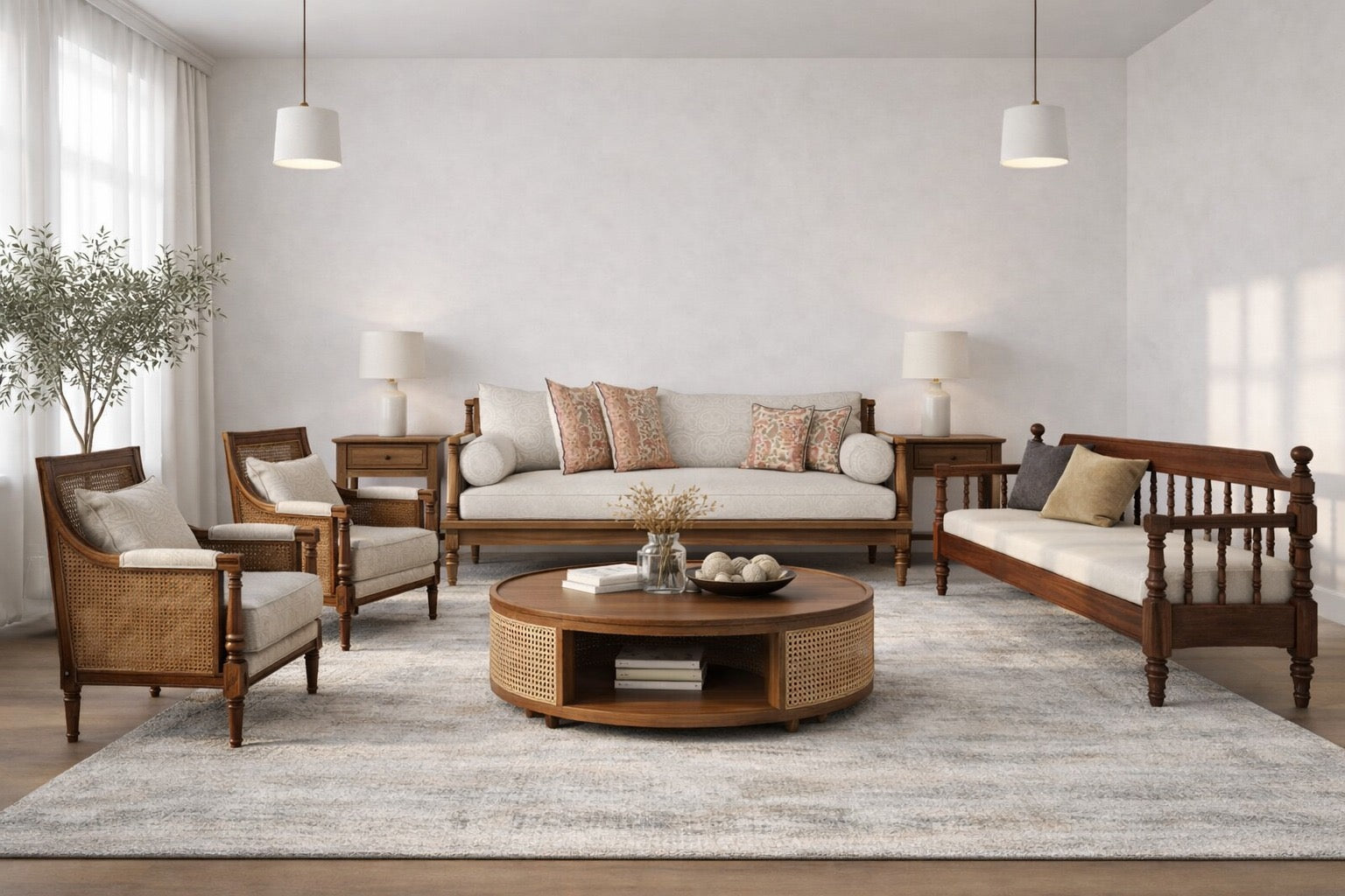 Designed to anchor your living space with quiet sophistication, this solid-wood sofa set blends classic craftsmanship with everyday comfort. The finely turned wooden details, natural cane accents, and soft neutral upholstery come together to create a warm, inviting aesthetic that never feels overdone.