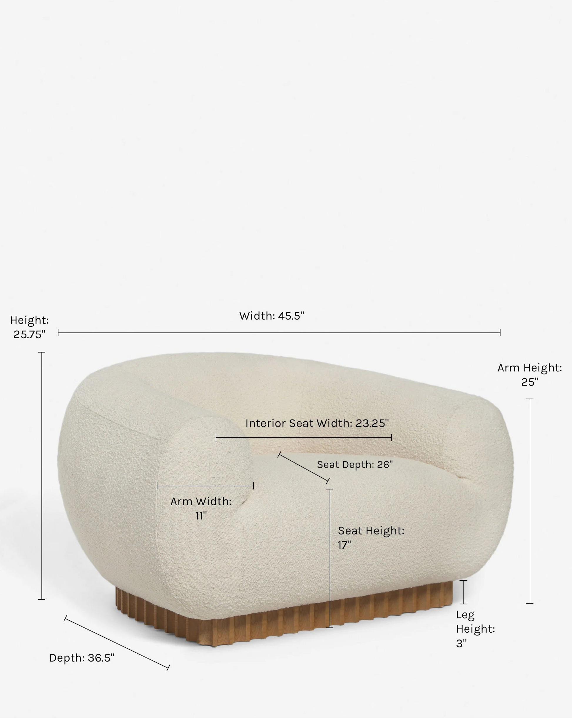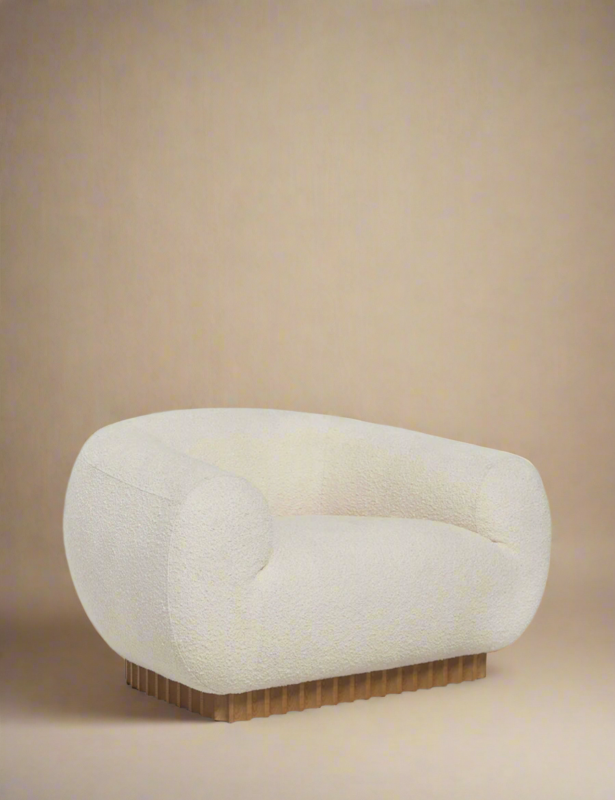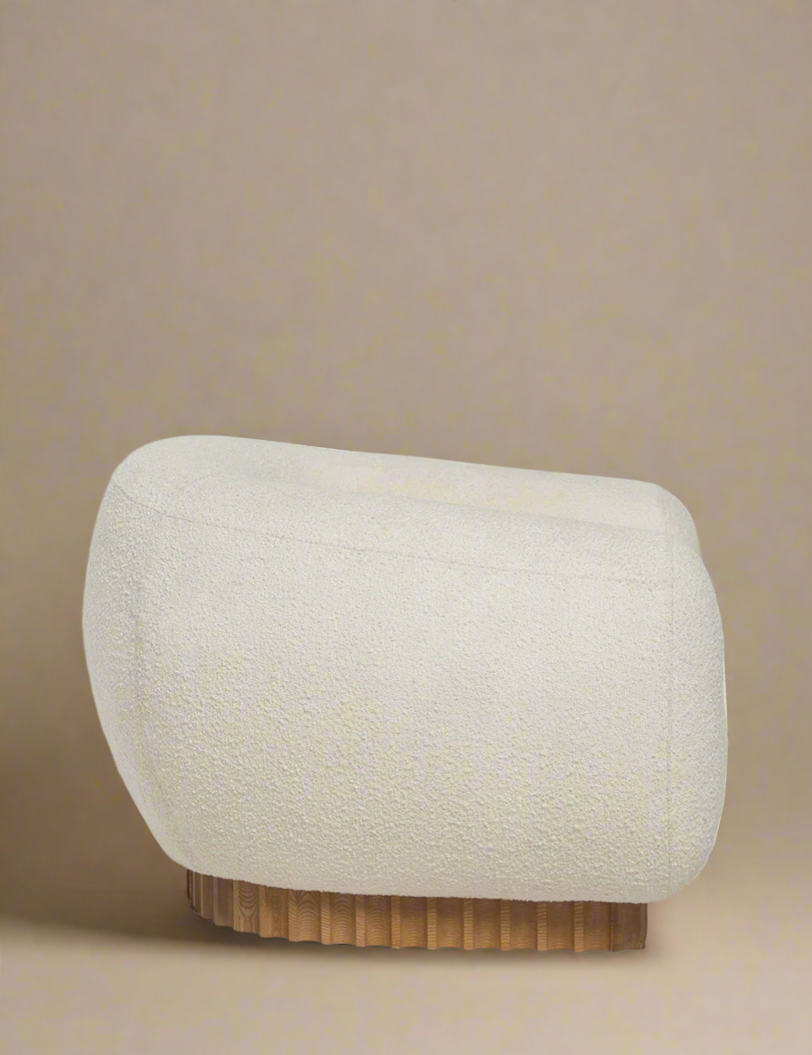 This sculptural seat is the perfect blend of softness and structure. With its plush, cloud-like form upholstered in creamy boucle, it brings a cozy, inviting touch to any space. The base is crafted from solid ashwood with a fluted finish, adding warmth and texture while offering a grounded contrast to the curvy top.
