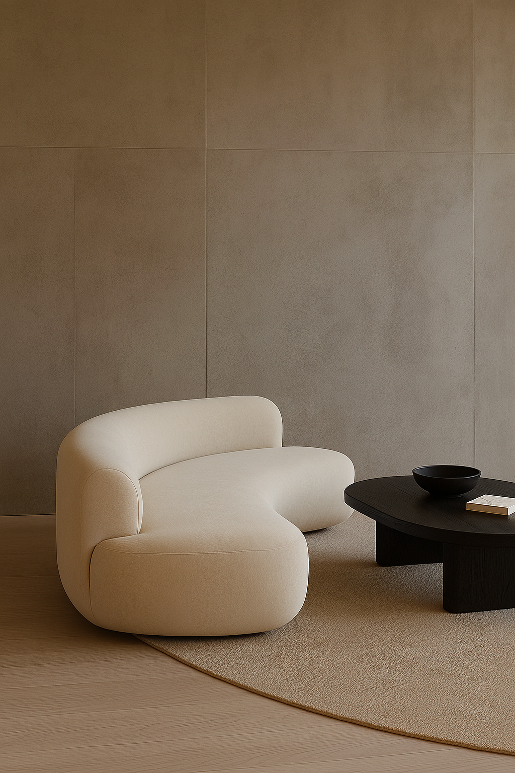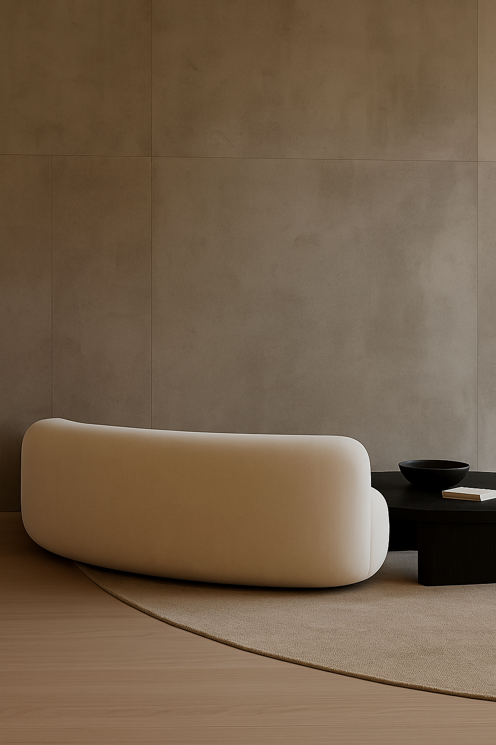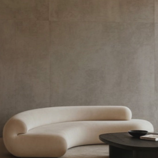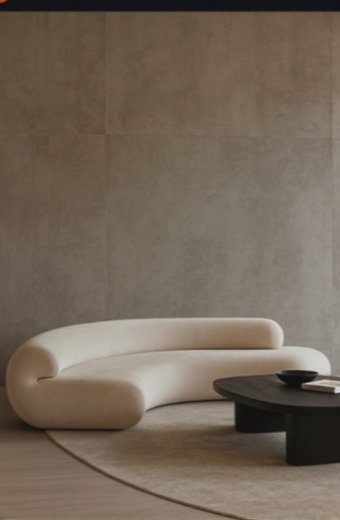Upholstered in plush cream fabric and crafted with a continuous flowing silhouette, it adds a calming presence to any space. The gentle arc of its design invites conversation and comfort, while the low-profile structure enhances its modern appeal. Perfect for those who seek understated luxury and timeless design.