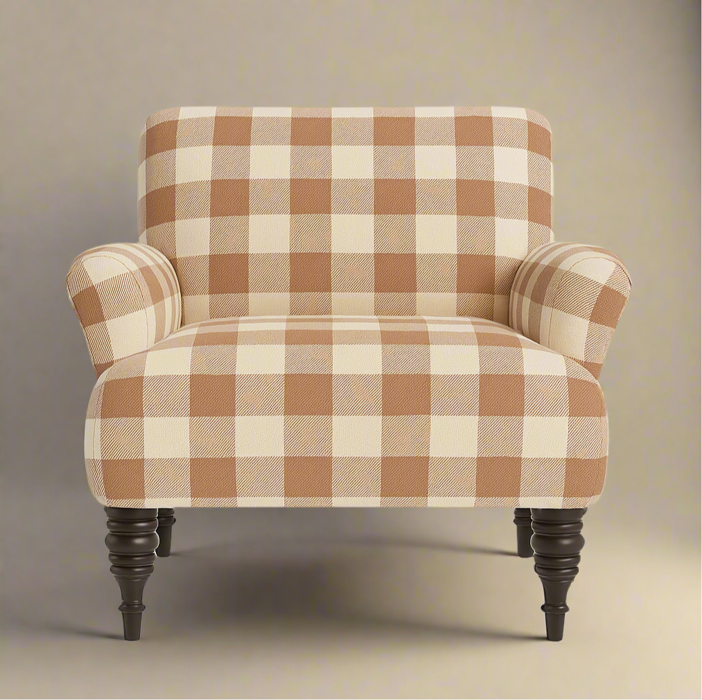 This charming armchair brings a warm, countryside elegance to any room with its soft Gingham plaid upholstery. Whether placed in a sunlit reading nook or a cozy living room corner, this piece invites comfort and quiet moments, making it the perfect blend of style and relaxation.