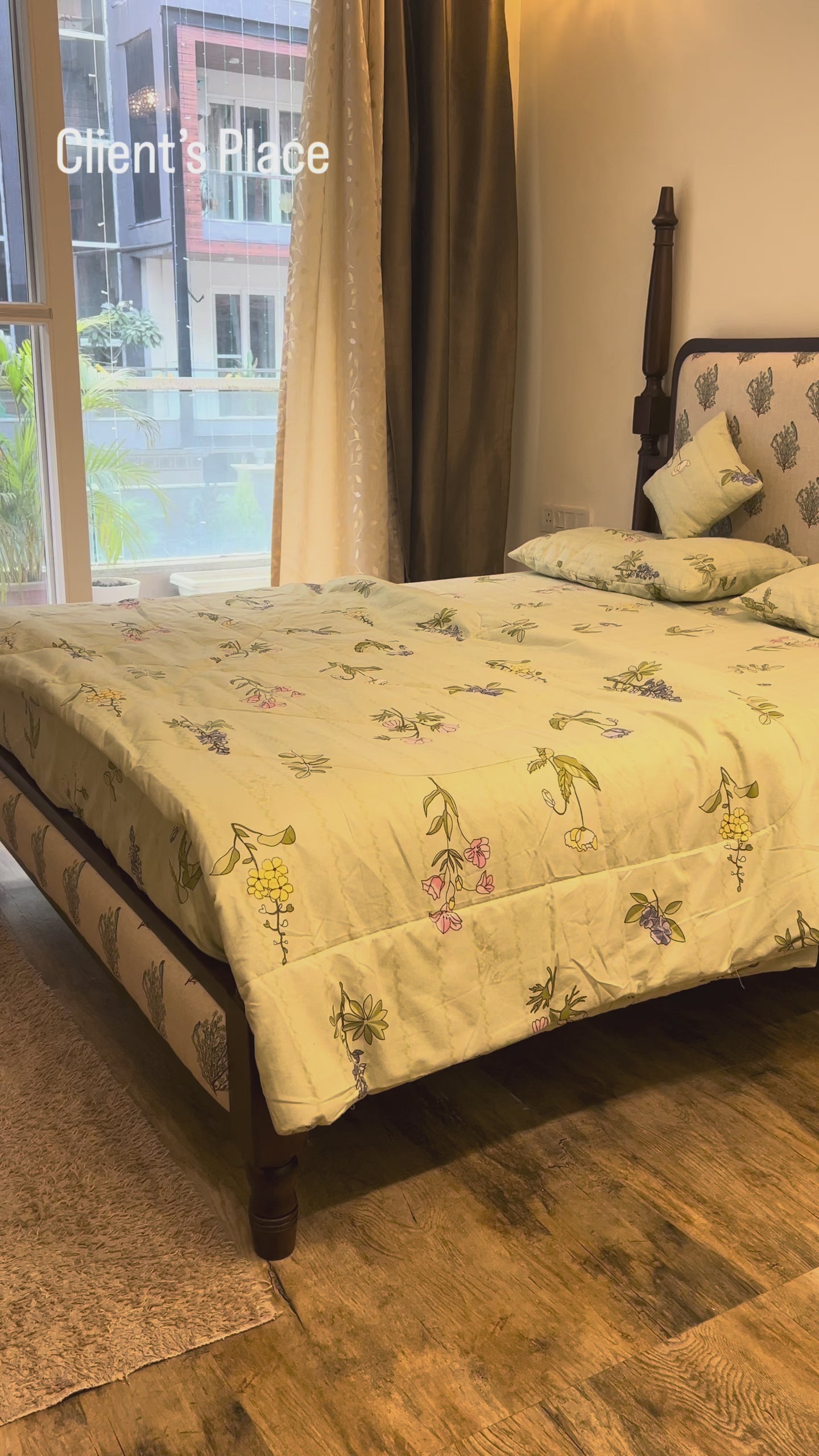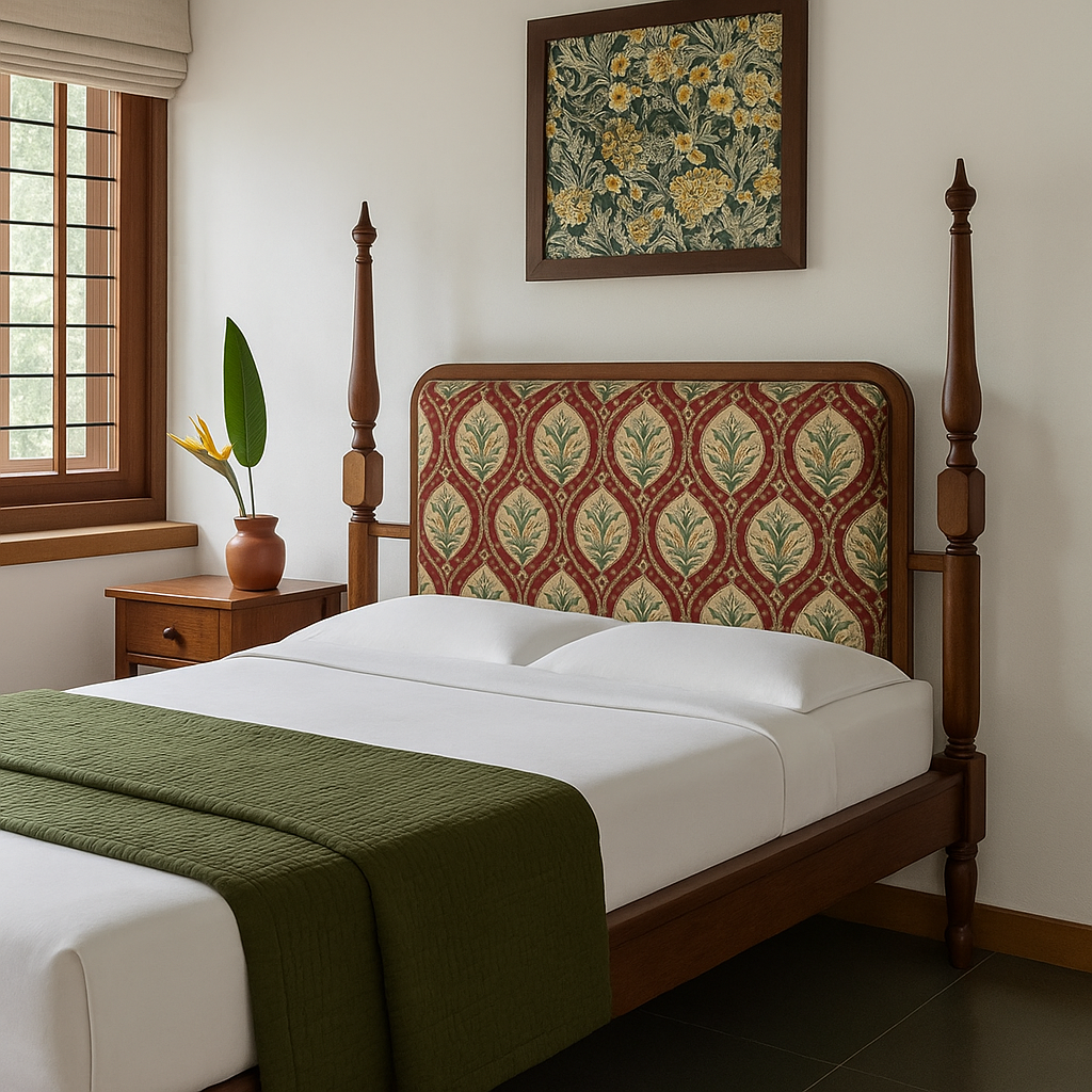 Crafted in rich teak wood and upholstered in regal hand-block printed velvet, Nilaya is a tribute to timeless Indian artistry. The tall four-poster frame adds grandeur, while the intricately patterned fabric—featuring heritage floral motifs in earthy reds and greens—evokes a sense of old-world elegance. Perfect for those who appreciate craftsmanship with cultural roots, this bed transforms any space into a serene retreat steeped in tradition.