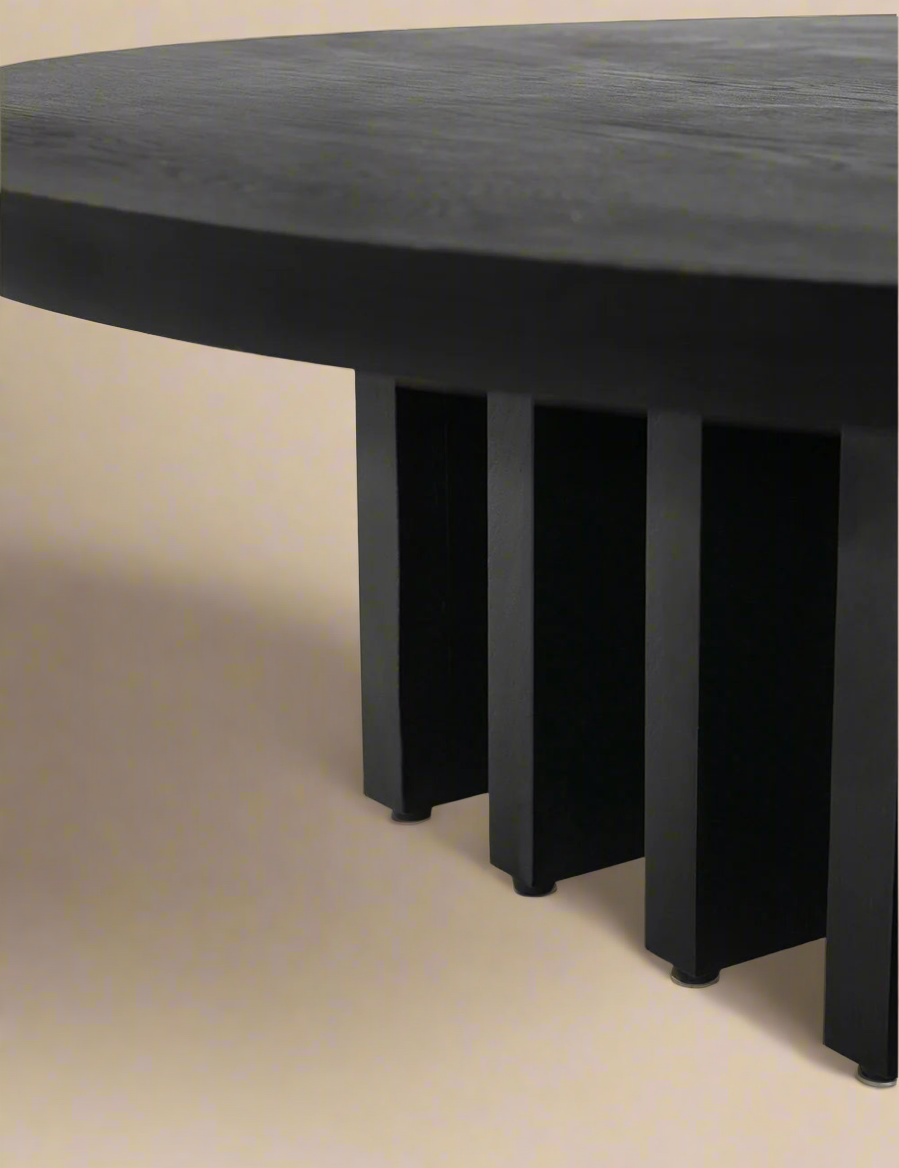 Crafted for the contemporary connoisseur, Obsidian Orbit is a round coffee table that redefines minimalism with a dramatic edge. Its solid black finish exudes sophistication, while the architectural slatted base adds depth, rhythm, and intrigue from every angle. The wide circular top offers generous space for styling — whether with books, ceramics, or nothing at all.