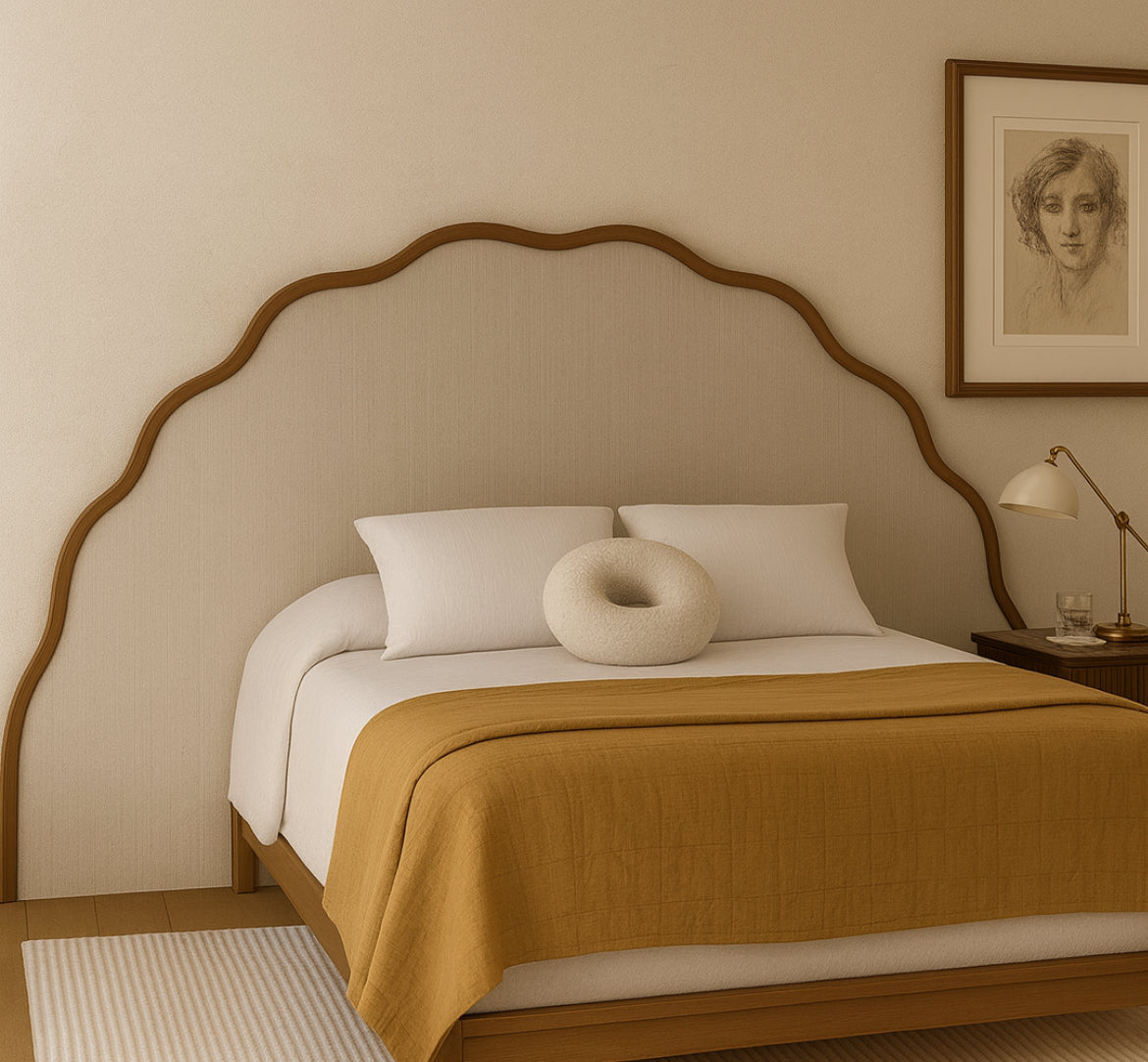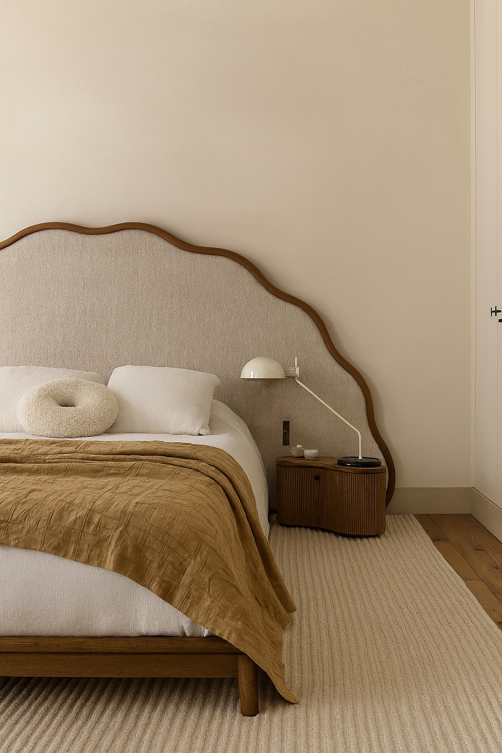 This bed is a perfect blend of organic curves and understated elegance, making it a statement piece for any bedroom. The scalloped headboard, framed in warm wood, adds a touch of artistry while the soft, textured upholstery invites comfort. Paired with a minimalist wooden base and earthy-toned bedding, it embodies modern serenity with a hint of vintage charm.