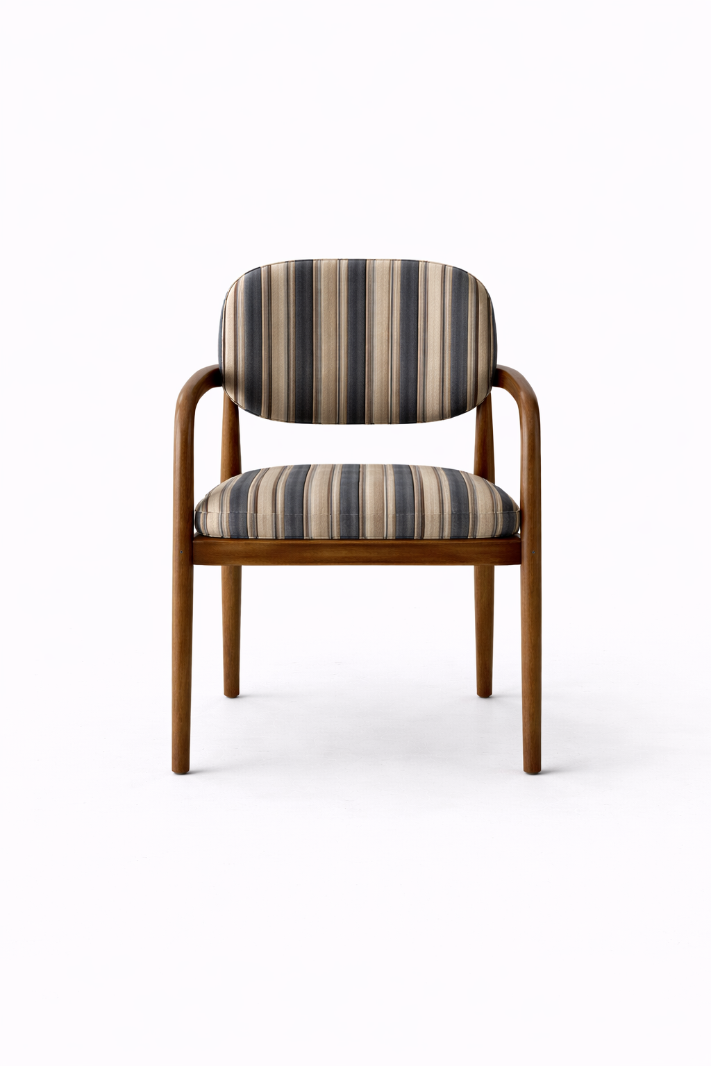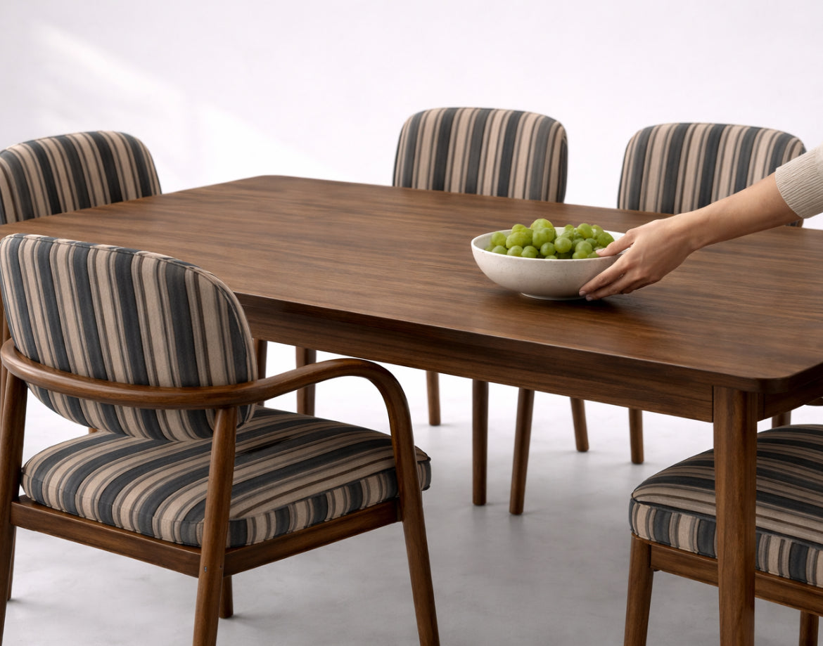 Crafted in rich solid wood and upholstered in timeless navy and beige stripes, this set adds a refined charm to any dining space. The sleek curves of the chairs paired with a clean-lined table reflect mid-century modern elegance