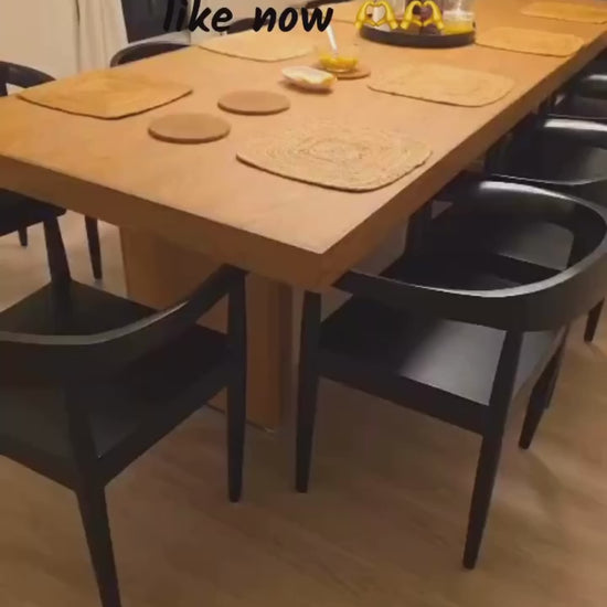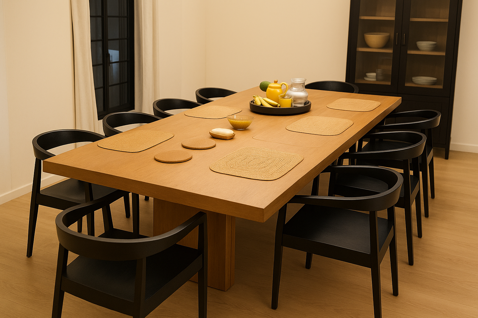 This handcrafted dining set brings together minimalist design and exceptional craftsmanship. The solid-wood table features clean lines, a thick profile, and a warm natural finish that instantly elevates any dining space.