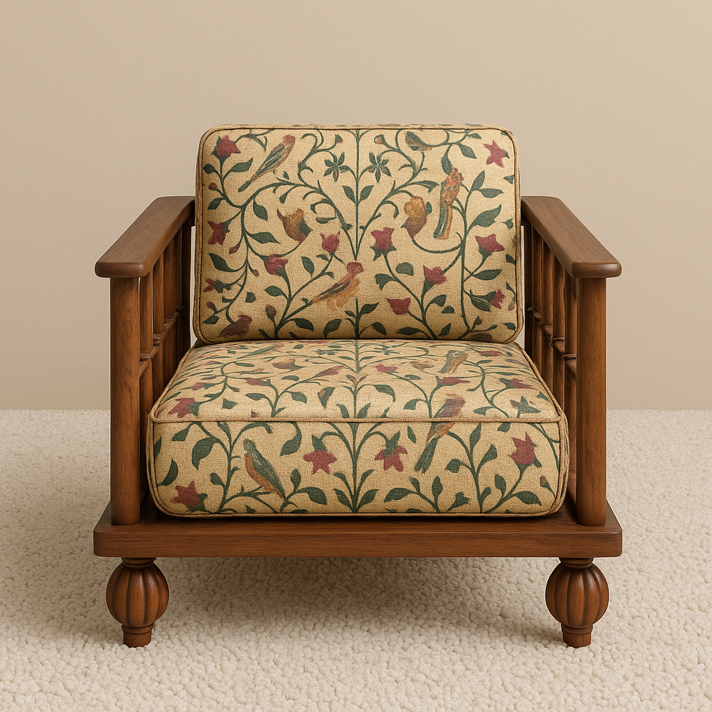 Rooted in timeless craftsmanship and inspired by the poetic beauty of nature, the Gulmohar Armchair is where elegance meets serenity. Handcrafted in Teak wood with gently arched details and turned legs, its sturdy frame exudes heritage charm.