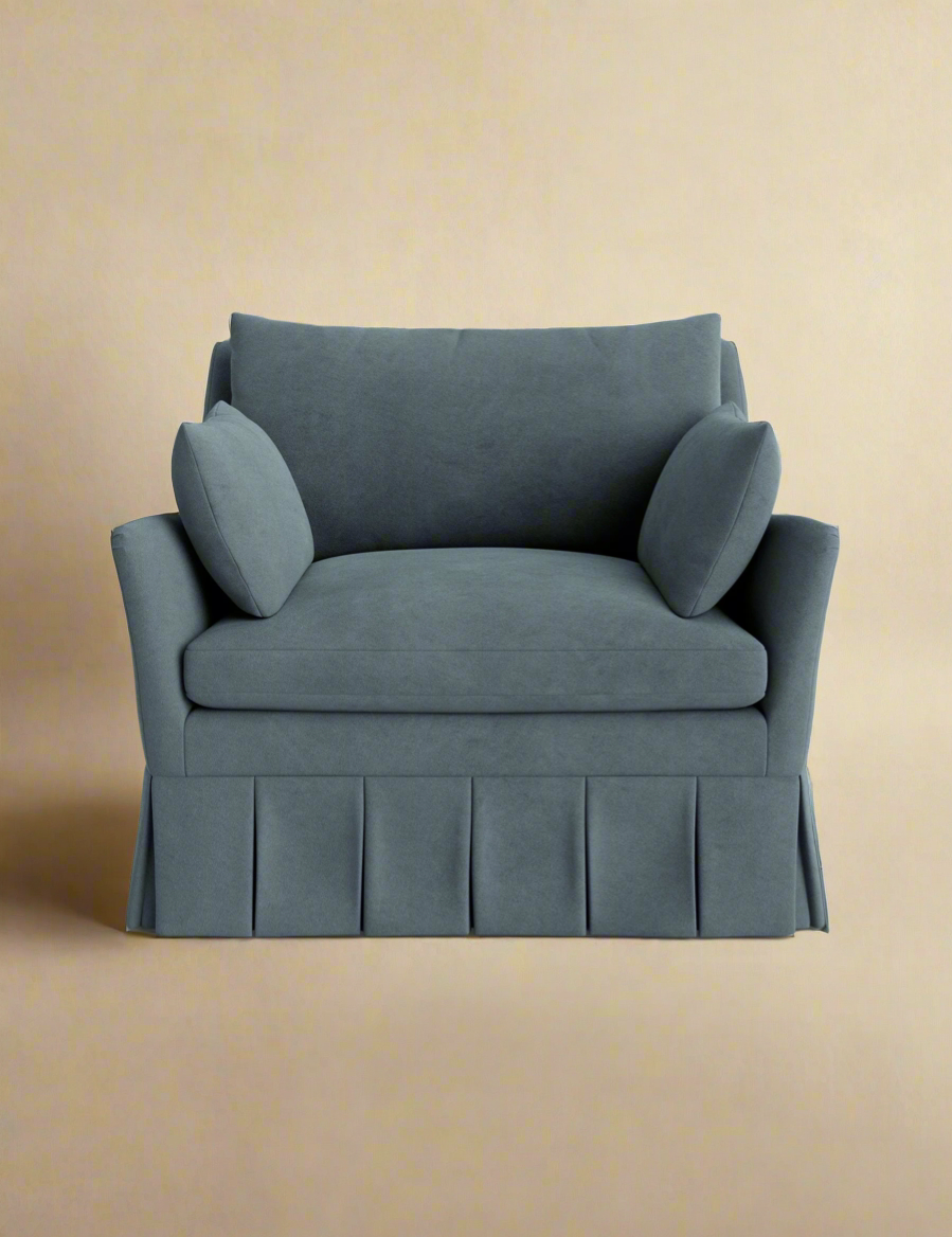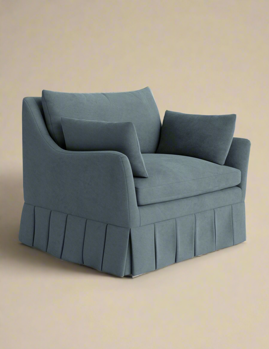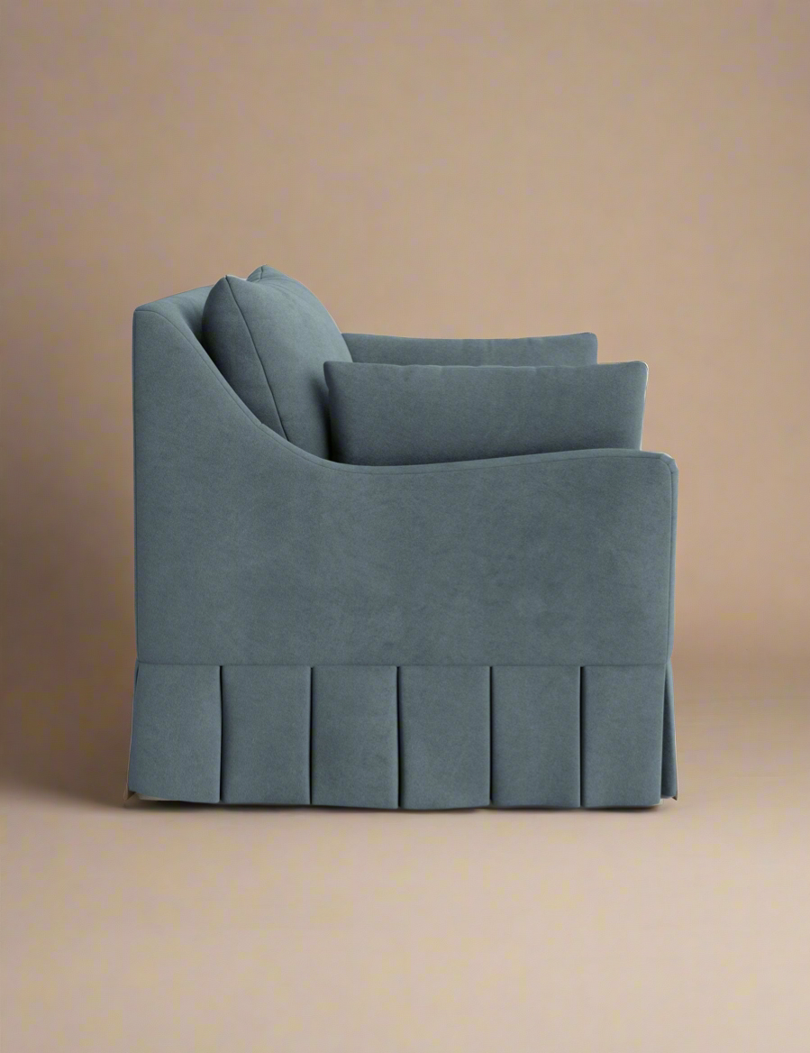 This elegant armchair exudes cozy sophistication with its deep, cushioned seat and timeless pleated skirt detailing. Upholstered in a rich, smoky suede fabric, it features plush back and side pillows that offer exceptional comfort and support.