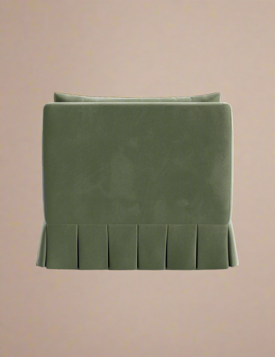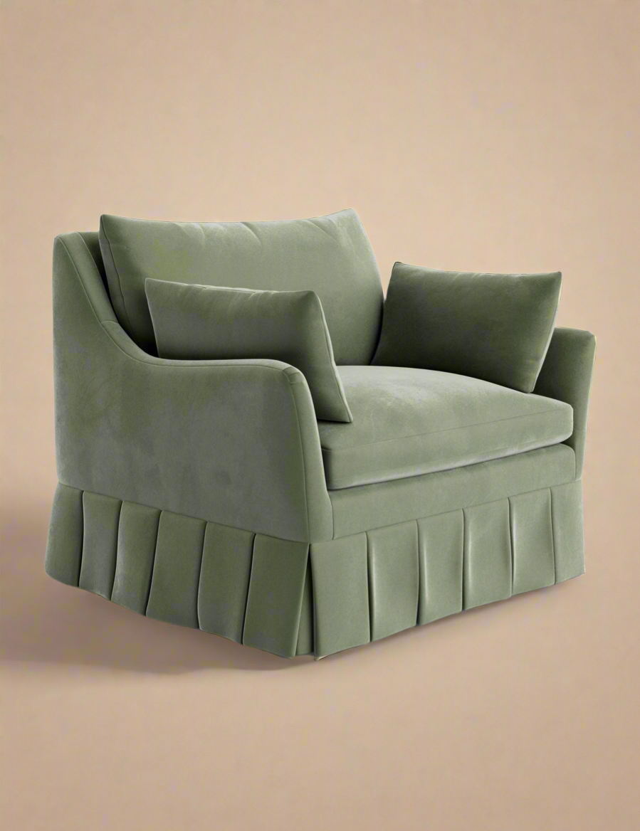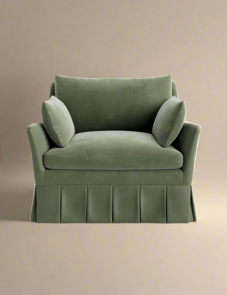 This elegant armchair exudes cozy sophistication with its deep, cushioned seat and timeless pleated skirt detailing. Upholstered in a rich, smoky suede fabric, it features plush back and side pillows that offer exceptional comfort and support.